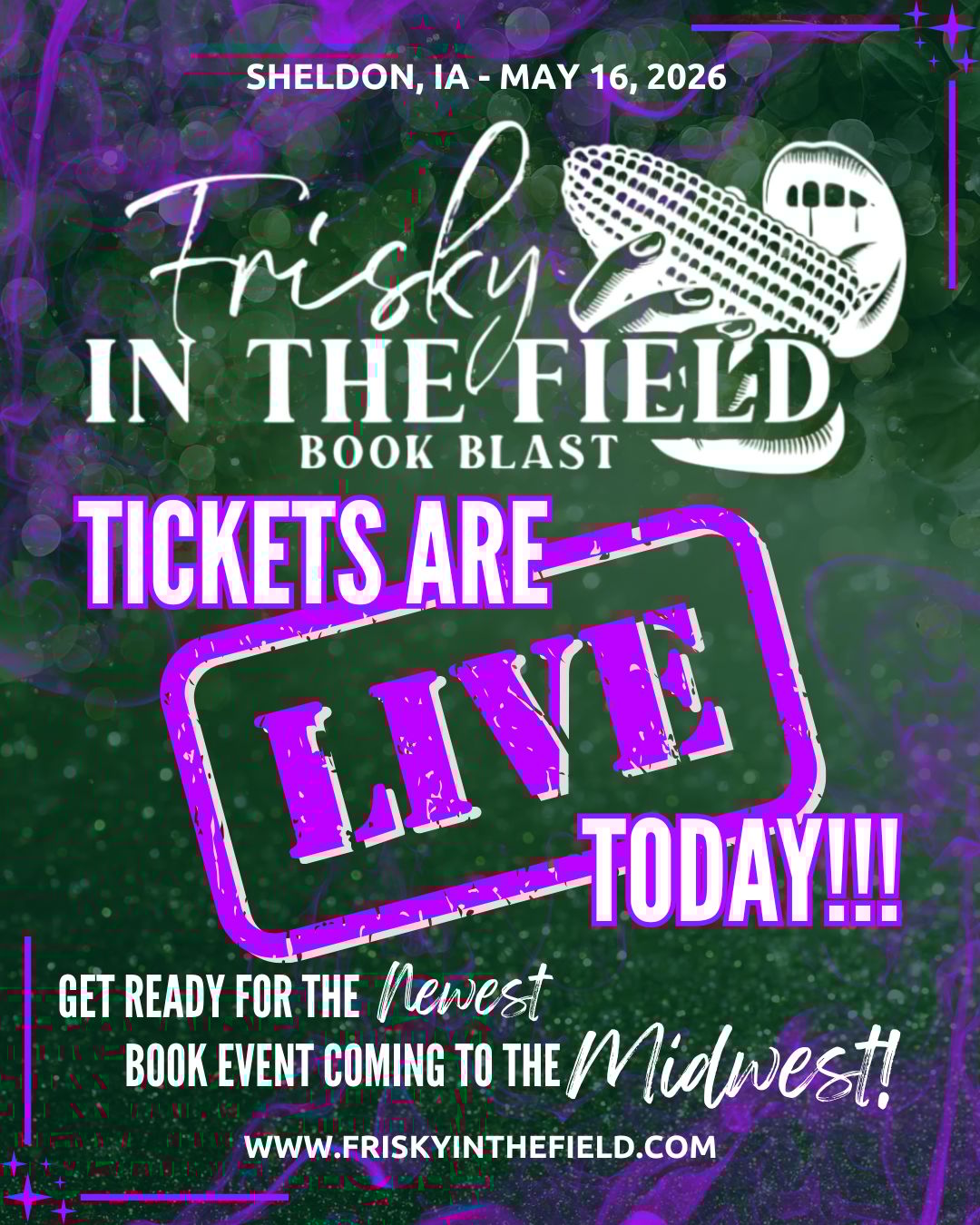 TICKETS ARE NOW AVAILABLE for Frisky in the Field 2026, the newest book signing in the Midwest! Grab your tickets NOW for Frisky, which is held in Sheldon, Iowa on May 16th and come see me and grab my latest books!